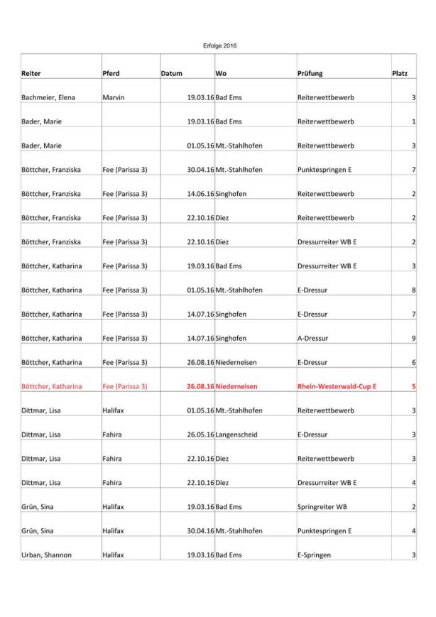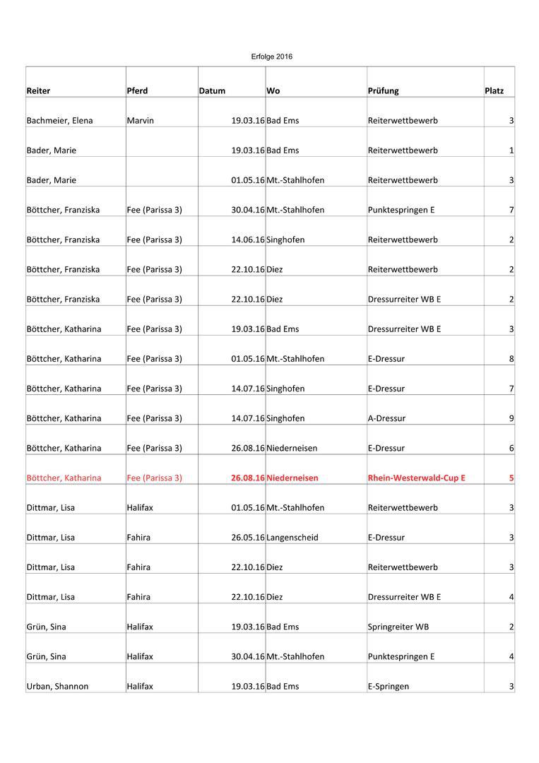 Ein erfolgreiches Jahr für unsere Turnierreiter neigt sich dem Ende. Wir sprechen allen (auch denen, die sich auf der Liste nicht eingetragen haben) unsere herzlichsten Glückwünsche zu ihren reiterlichen Erfolgen aus. Besonders gratulieren wir Melanie Wirth für den 2. Platz in der Bezirksmeisterschaft Dressur LK4, Alina Wirges für den 1. Platz im Rhein-Westerwald-Cup und Petra Wirth für den 3. Platz im Rhein-Westerwald-Cup.